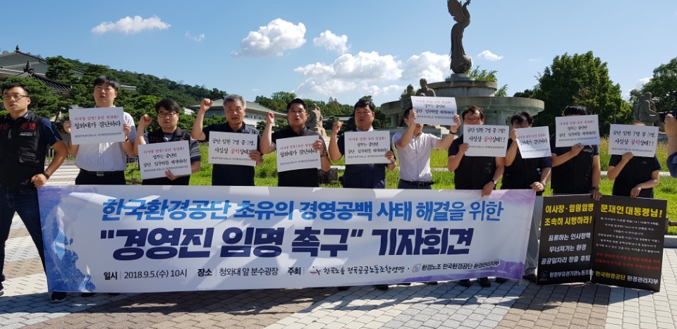 Çѱ¹³ëÃÑ °ø°ø¿¬¸Í°ú ȯ°æºÎÀ¯°ü±â°ü³ëÁ¶ Çѱ¹È¯°æ°ø´Ü °ü¸®ÁöºÎ(À§¿øÀå ±èº´ÁØ)Àº 9¿ù 5ÀÏ, ¿ÀÀü 10½Ã, û¿Í´ë ºÐ¼ö´ë ¾Õ¿¡¼ "Çѱ¹È¯°æ°ø´Ü ÃÊÀ¯ÀÇ °æ¿µ°ø¹é»çÅÂ ÇØ°áÀ» À§ÇÑ °æ¿µÁø ÀÓ¸í Ã˱¸ ±âÀÚȸ°ß"À» ÇÏ¿´½À´Ï´Ù.