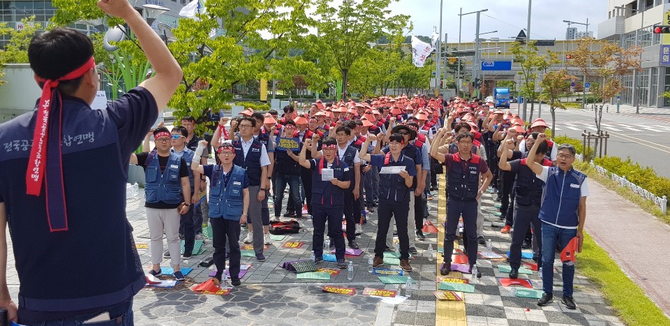 Çѱ¹³ëÃÑ Àü±¹°ø°ø³ëµ¿Á¶ÇÕ¿¬¸Í Çѱ¹°Ç¼³°ü¸®°ø»ç³ëÁ¶´Â 12ÀÏ(±Ý) ¿ÀÈÄ 2½Ã ±èõ Çѱ¹°Ç¼³°ü¸®°ø»ç º»»ç ¾Õ¿¡¼ ¡®»çÀå ¹× ÇϼöÀÎ »çÅð Ã˱¸¡¯ °áÀÇ´ëȸ¸¦ °³ÃÖÇß´Ù.