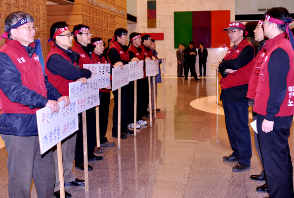 ¹®Á¦°¡ µÇ¾ú´Ù. ÀÌ¿¡ ³ëÁ¶´Â ¹®Á¦¸¦ ÃÖ¼ÒÈÇϱâÀ§ÇØ »çÃø¿¡ ´ëȸ¦ ¿ä±¸Çϰí Çù»óÀ» ½ÃµµÇÏ¿´À¸³ª »çÃøÀÇ °ÅÀý·Î ¹ýÀûÁ¶Ä¡ ¹× ÅõÀïÀ» ÇÒ ¼ö ¹Û¿¡ ¾ø´Â