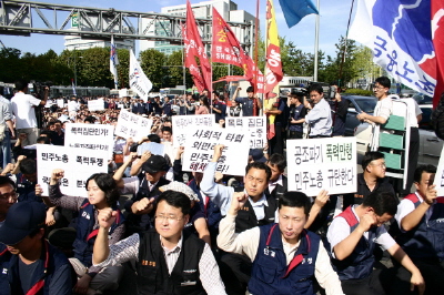 ¹ÎÁÖ³ëÃÑ ¾Õ¿¡ µµÂøÇÑ Á¶ÇÕ¿øµéÀº °áÀÇ´ëȸ¸¦ ÅëÇØ ¡°Çѱ¹³ëÃÑÀÌ Á¤ºÎ¿Í ½Î¿ì°í »ç¿ëÀÚ¿Í ÅõÀïÇÏ¸é¼ ÀÌ·ç¾î³½ ¿ª»ç»ó