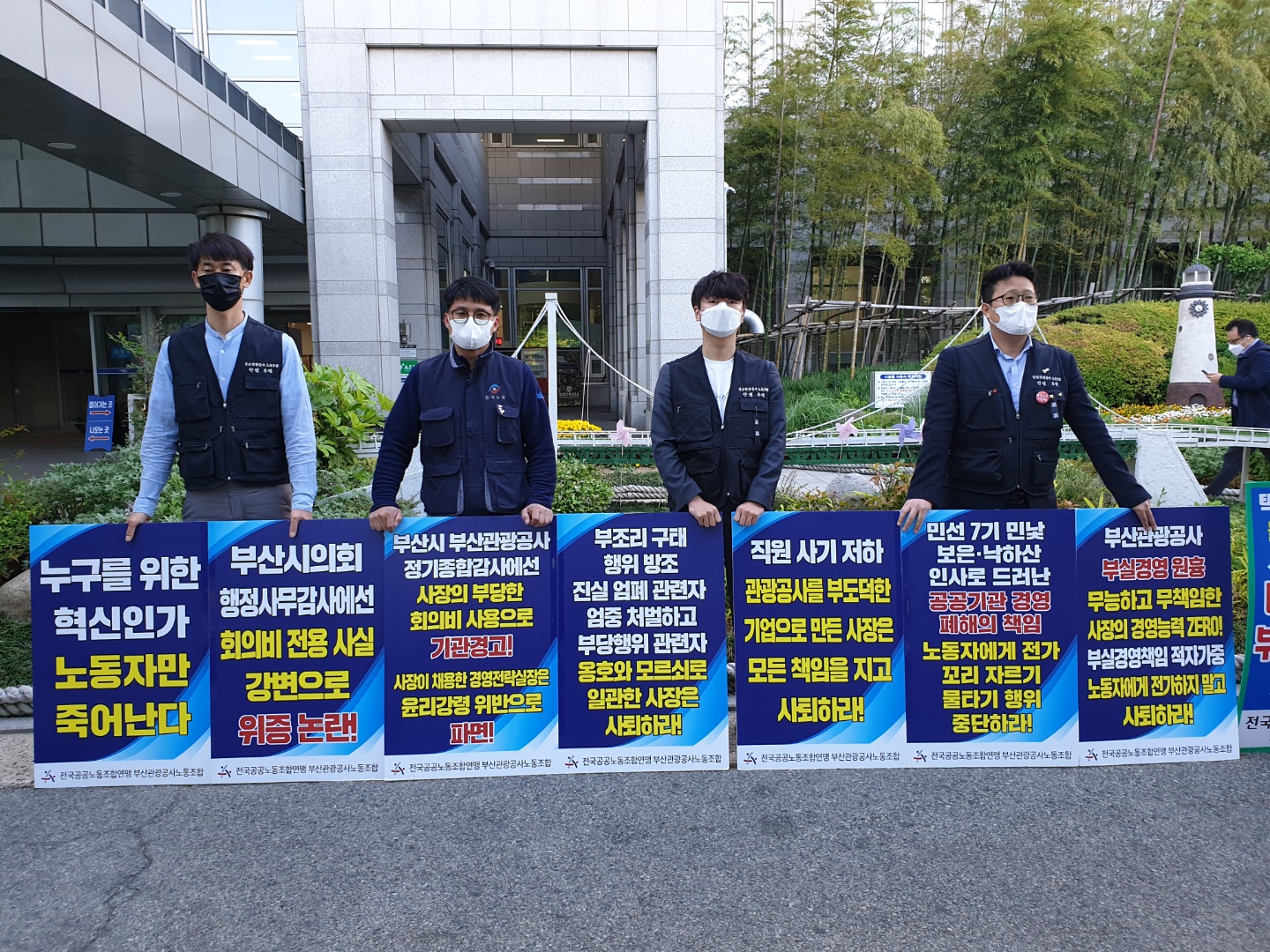 ºÎ»ê°ü±¤°ø»ç³ëµ¿Á¶ÇÕ(À§¿øÀå °û¿µºó, ÀÌÇÏ ³ëÁ¶)ÀÌ »çÀå ÅðÁøÀ» Ã˱¸Çϸç ÅõÀï¿¡ ³ª¼¹´Ù. 11ÀϺÎÅÍ ½ÃÀÛµÈ ½Ãû ¾Õ ÇÇÄϽÃÀ§´Â 8ÀÏ Â° À̾îÁö°í ÀÖ´Ù.