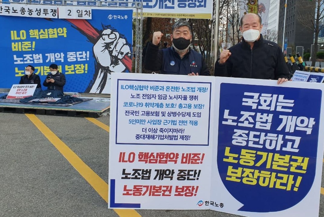 Çѱ¹³ëÃÑÀÌ ±¹Á¦³ëµ¿±â±¸(ILO) ±âº»Çù¾à ºñÁذú ³ëÁ¶¹ý °³Á¤¾È Æó±â¸¦ Ã˱¸ÇÏ´Â ³ó¼º ÅõÀï¿¡ µ¹ÀÔÇß´Ù.