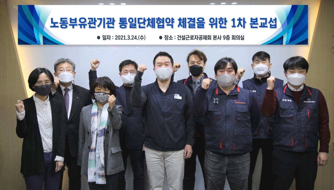 ³ëµ¿ºÎÀ¯°ü±â°ü°ú ³ëµ¿ºÎÀ¯°ü±â°ü³ëµ¿Á¶ÇÕ(À§¿øÀå ±èÁöÈ«, ÀÌÇÏ ³ëµ¿³ëÁ¶)ÀÇ ÅëÀÏ´ÜüÇù¾à ü°áÀ» À§ÇÑ 1Â÷ º»±³¼·ÀÌ 24ÀÏ(¼ö) °Ç¼³±Ù·ÎÀÚ°øÁ¦È¸ ȸÀǽǿ¡¼ ¿·È´Ù.
