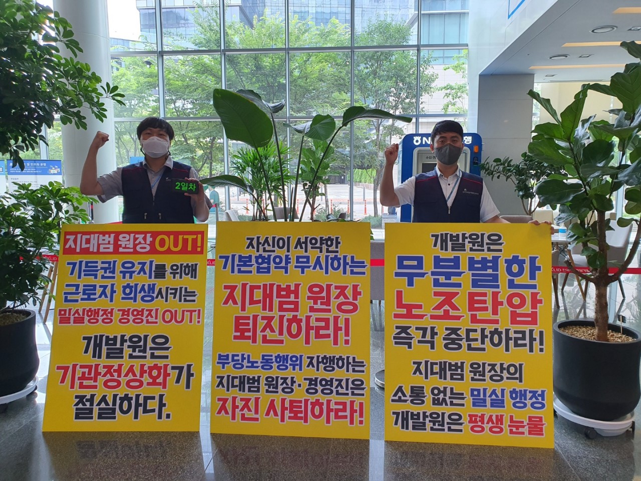 Çѱ¹Áö¿ªÁ¤º¸°³¹ß¿ø³ëÁ¶(À§¿øÀå Çö´ë½Ä)°¡ ³ëÁ¶Åº¾Ð Áߴܰú ±â°ü Á¤»ó¿î¿µÀ» Ã˱¸ÇÏ´Â Çö¼ö¸·À» °ÔÀçÇϰí ÇÇÄÏ ½ÃÀ§¿¡ ³ª¼¹´Ù.
