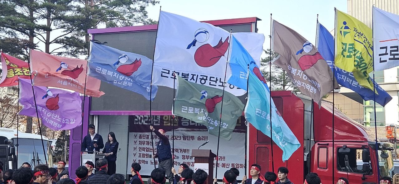 ±Ù·Îº¹Áö°ø´Ü³ëÁ¶(À§¿øÀå ¹ÚÁø¿ì)°¡ 11¿ù 23ÀÏ(¸ñ) ¿ÀÈÄ ¿ï»ê ±Ù·Îº¹Áö°ø´Üº»ºÎ ¾Õ¿¡¼ “ÀÓ±Ý ½Â¸®! ±Ù·ÎÁ¶°Ç °³¼±! ÃÑ·Â ÅõÀï °áÀÇ´ëȸ”¸¦ °³ÃÖÇß´Ù.