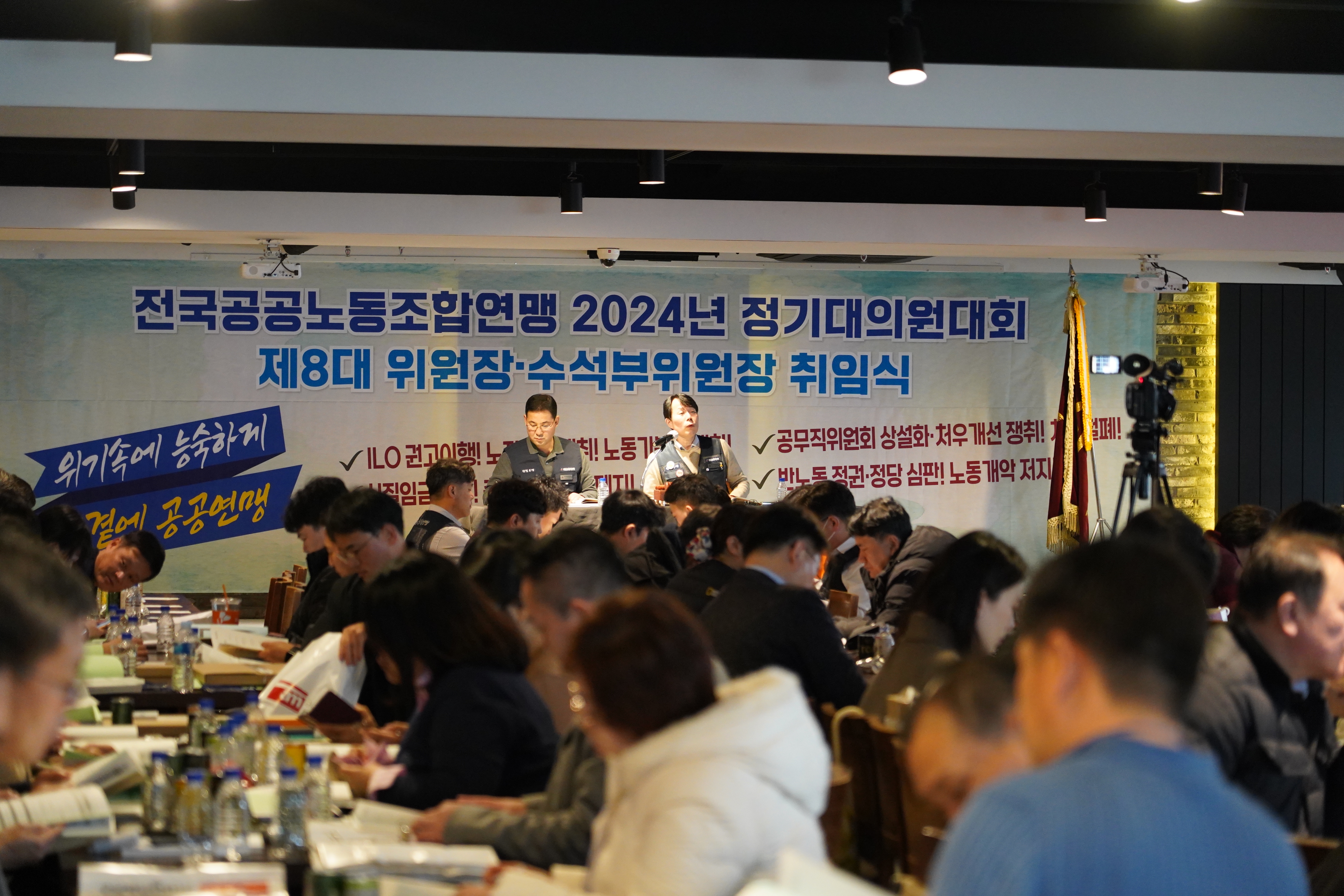 Á¦8´ë Á¤Á¤Èñ À§¿øÀåÀº ÃëÀӻ翡¼ “°ø°ø³ëµ¿ÀÚ¶ó´Â ÀÌÀ¯·Î ÀÓ±ÝÀλóÀÌ Á¦Çѵǰí, º¹Áö¸¦ Ãà¼ÒÇϰí, Á¤ºÎ °ø°øÁ¤Ã¥ ½ÇÆÐ¸¦ °ø°ø³ëµ¿ÀÚ¿¡°Ô Àü°¡ÇÏ¸é¼ °Þ´Â ¼·¯¿ò°ú ºÐ³ë, ¼Ò´Ü»çÀÇ ¼Ò¿Ü°¨°ú ¾Æ½¬¿ò, Á¤ºÎ ¼ÒÅëⱸÀÇ ºÎÀç, °ø¹«Á÷³ëµ¿ÀÚÀÇ ºÒÆòµîÇÑ Ã³¿ì µî ÀÌ·¯ÇÑ ºÎ´çÇÔÀ» ÇØ°áÇϱâ À§Çؼ ¿ì¸®´Â ¶Ê¶Ê ¹¶ÃÄ¾ß ÇÑ´Ù. Áױ⠻ì±â·Î ½Î¿ìÁö ¾ÊÀ¸¸é ½Â¸®ÇÒ ¼ö ¾ø´Ù.”¸ç “¿ì¸® °ø°ø¿¬¸ÍÀÌ ÁöÇý·Î¿î ±³¼··Â°ú ½Î¿ò¿¡ ÀÖ¾î¼ ½Â¸®¸¦ ¹Ýµå½Ã ÀïÃëÇÒ ¼ö ÀÖ´Â ÅõÀï·Â, ÀÌ µÎ °¡Áö¸¦ ÀïÃëÇÒ ¼ö ÀÖµµ·Ï ÃÖ¼±À» ´ÙÇϰڴÙ.”°í ¸»Çß´Ù. ÀÌ¾î “ÆòµîÀ» ³Ñ¾î Çϳª µÈ ¿¬¸Í, ³» °ç¿¡ °ø°ø¿¬¸ÍÀÌ ÇÔ²²Çϰí ÀÖ±¸³ª ´À³¥ ¼ö ÀÖ´Â ¿¬¸Í, ±×·± ¿¬¸ÍÀ» ÇÔ²² ¸¸µé¾î °¡°Ú´Ù.”°í °¢¿À¸¦ ÀüÇß´Ù.