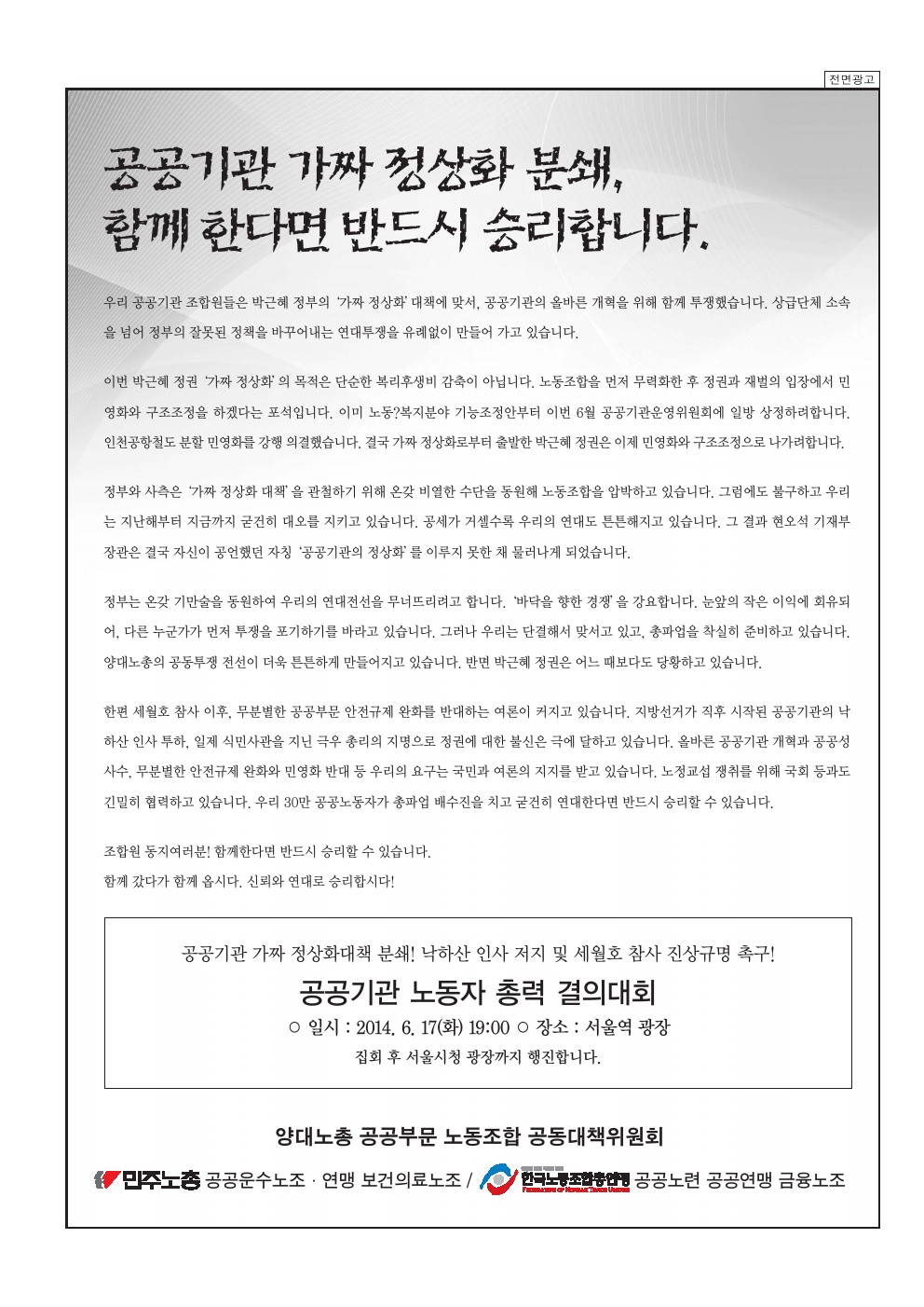 ¿ì¸® °ø°ø±â°ü Á¶ÇÕ¿øµéÀº ¹Ú±ÙÇý Á¤ºÎÀÇ ¡®°¡Â¥ Á¤»óÈ¡¯´ëÃ¥¿¡ ¸Â¼, °ø°ø±â°üÀÇ ¿Ã¹Ù¸¥ °³ÇõÀ» À§ÇØ ÇÔ²² ÅõÀïÇß½À´Ï´Ù. »ó±Þ´Üü ¼Ò¼ÓÀ» ³Ñ¾î Á¤ºÎÀÇ À߸øµÈ Á¤Ã¥À» ¹Ù²Ù¾î³»´Â ¿¬´ëÅõÀïÀ» À¯·Ê¾øÀÌ ¸¸µé¾î °¡°í ÀÖ½À´Ï´Ù.